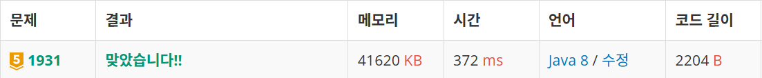 https://www.acmicpc.net/problem/1931 [풀이과정]끝나는 시간을 기준으로 오름차순 정렬을 해주고끝나는 시간이 같을 때는 시작시간을 기준으로 오름차순 정렬을 해준다-> 기준을 안 잡아주거나 내림차순으로 하면 틀림-> 반례 중, 시작시간이 끝시간보다 느린 경우가 있음. 문제가 좀 이상함. [코드]import java.io.BufferedReader;import java.io.IOException;import java.io.InputStreamReader;import java.util.Comparator;import java.util.PriorityQueue;import java.util.StringTokenizer;/*N개의 회의회의 시작시간, 끝나는 시간 주어짐겹치지 않게 하며 ..