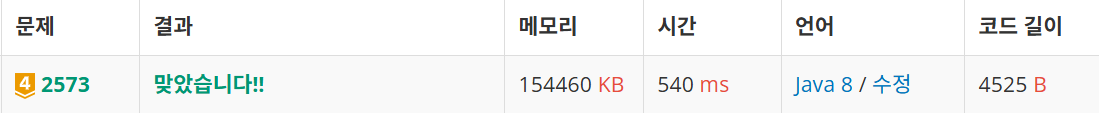 https://www.acmicpc.net/problem/2573 [풀이과정]계속 시간초과가 나서 미치는 줄 ㅠㅠ한 번의 탐색으로 가능한 작업을 여러 탐색으로 했던 게 문제였다.new보다는 fill로 배열을 재사용하는 게 더 낫다는 걸 배움. [코드]import java.io.BufferedReader;import java.io.IOException;import java.io.InputStreamReader;import java.util.*;/*칸의 높이는 바다와 인접한 면의 개수만큼 줄어듦.0이하로는 줄어들지 않음빙산이 두 덩어리 이상으로 분리되는 최소의 시간(년)을 구하기 */public class Main { static BufferedReader br = new BufferedReader(n..